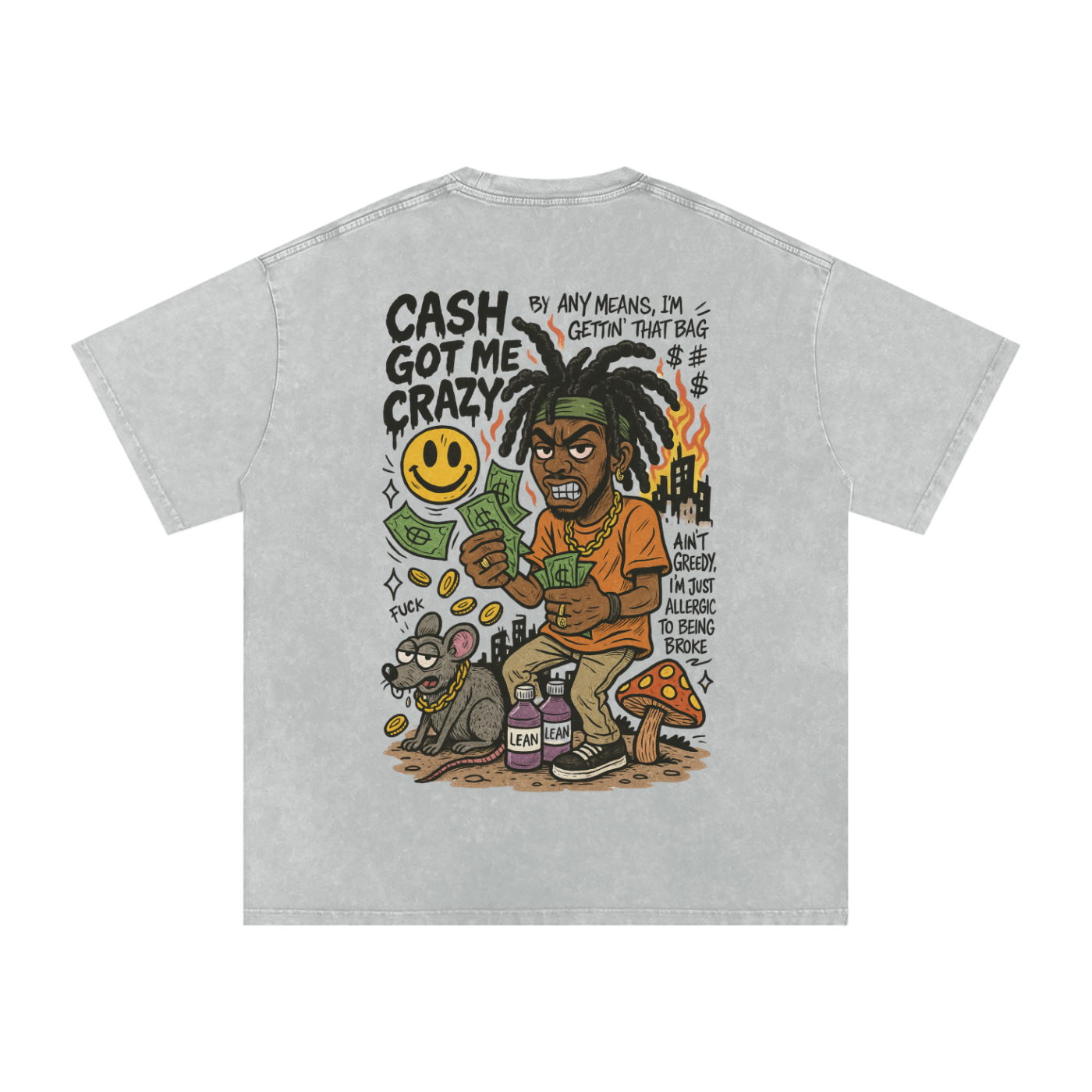 Step into the raw, unfiltered grind with our “Cash Got Me Crazy” tee — a gritty, street-hardened statement piece built for hustlers who get it by any means. This design pops with bold, cartoon-styled chaos: a dread-headed savage grippin' stacks, gold teeth gleaming, and flames licking off his crown like he was born in the fire. A smug rat dripped in a chain lurks below, surrounded by lean bottles, shrooms, and dirty city ruins — symbolizing survival through the madness.