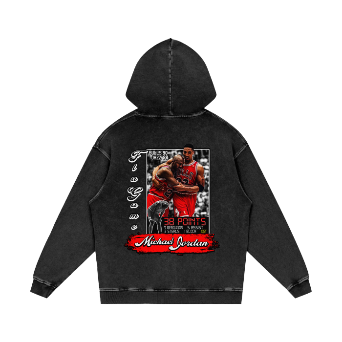 This hoodie don’t just rep a moment — it reps a mindset. The iconic 1997 Flu Game is frozen on the back of this piece, showing a fatigued Michael Jordan leaning on Scottie Pippen, sweat-soaked, but still victorious. Bulls 90, Jazz 88 — a win built on willpower, not wellness.