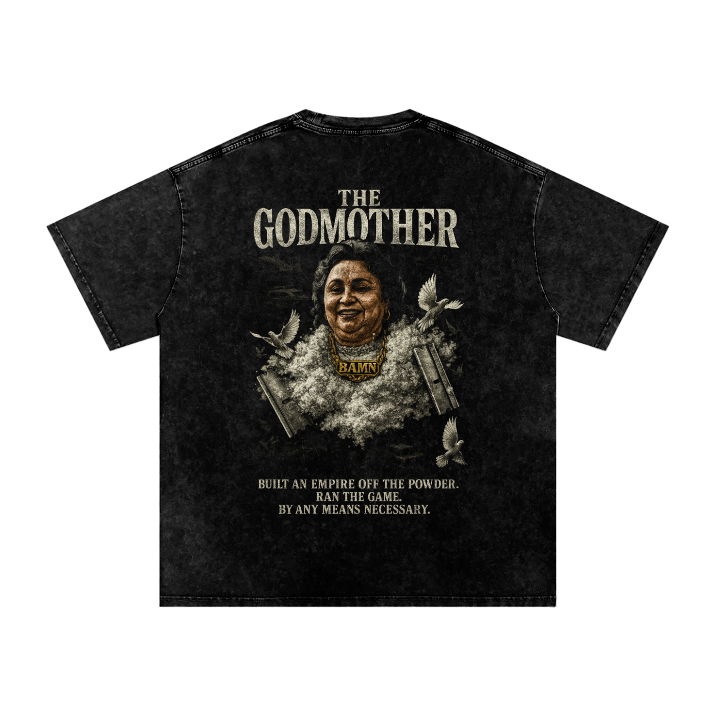 “The Godmother” tee is a tribute to the matriarch of mayhem. A woman who moved weight like war, prayed in powder, and cashed out with cold precision.