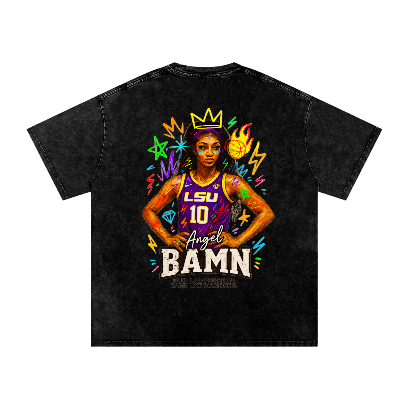 Decked in LSU purple and gold, this tee features Angel with her hands on her hips and the game in her stare. A crown floats above her head like prophecy. Around her? Street-lit scribbles of diamonds, fireballs, lightning—because heaven’s got graffiti too.