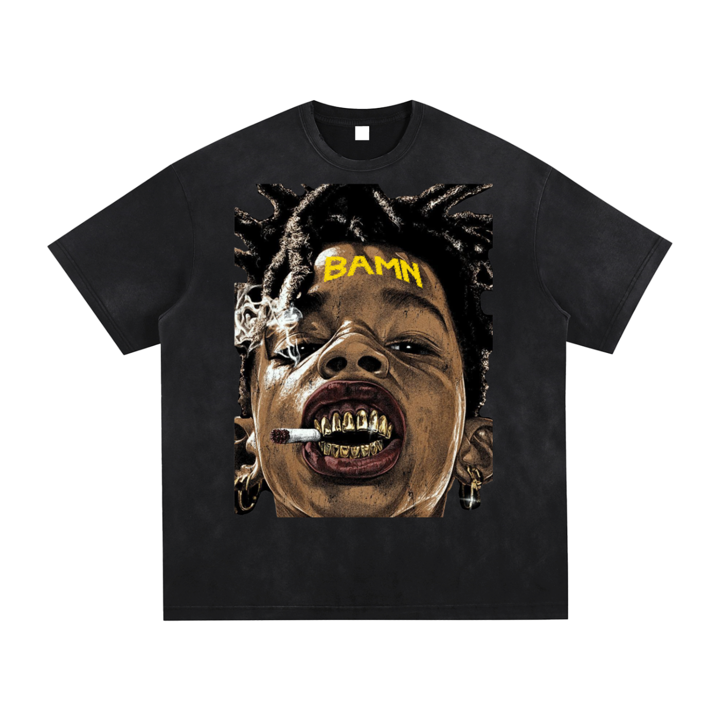 This “BAMN: Hustle Louder” tee is a savage flex for the bold and unapologetic. The front hits hard with a raw, in-your-face graphic — a gold-grilled menace blowin' smoke with “BAMN” tatted across the forehead like a brand of war. It’s gritty, detailed, and full of attitude, capturing that By Any Means Necessary energy straight from the block to your chest.