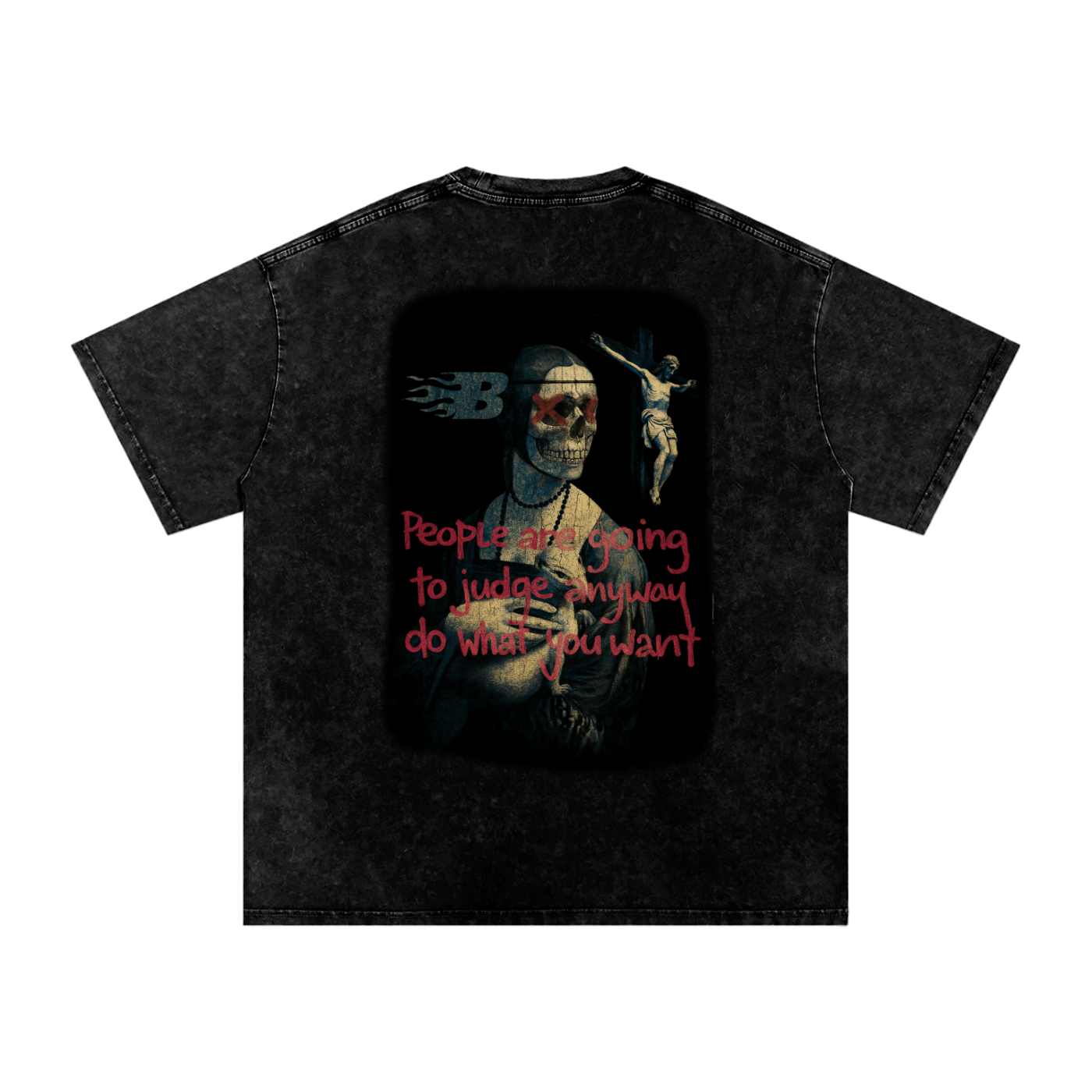 Saint or sinner, you still get crucified — so do what the f* you want**. This tee is for the ones who turned pain into style and guilt into gasoline. Renaissance meets street anarchy — a skeletal Mona Lisa rocking red Xs like she seen too much, prayed too long, and stopped caring halfway through the Hail Mary.