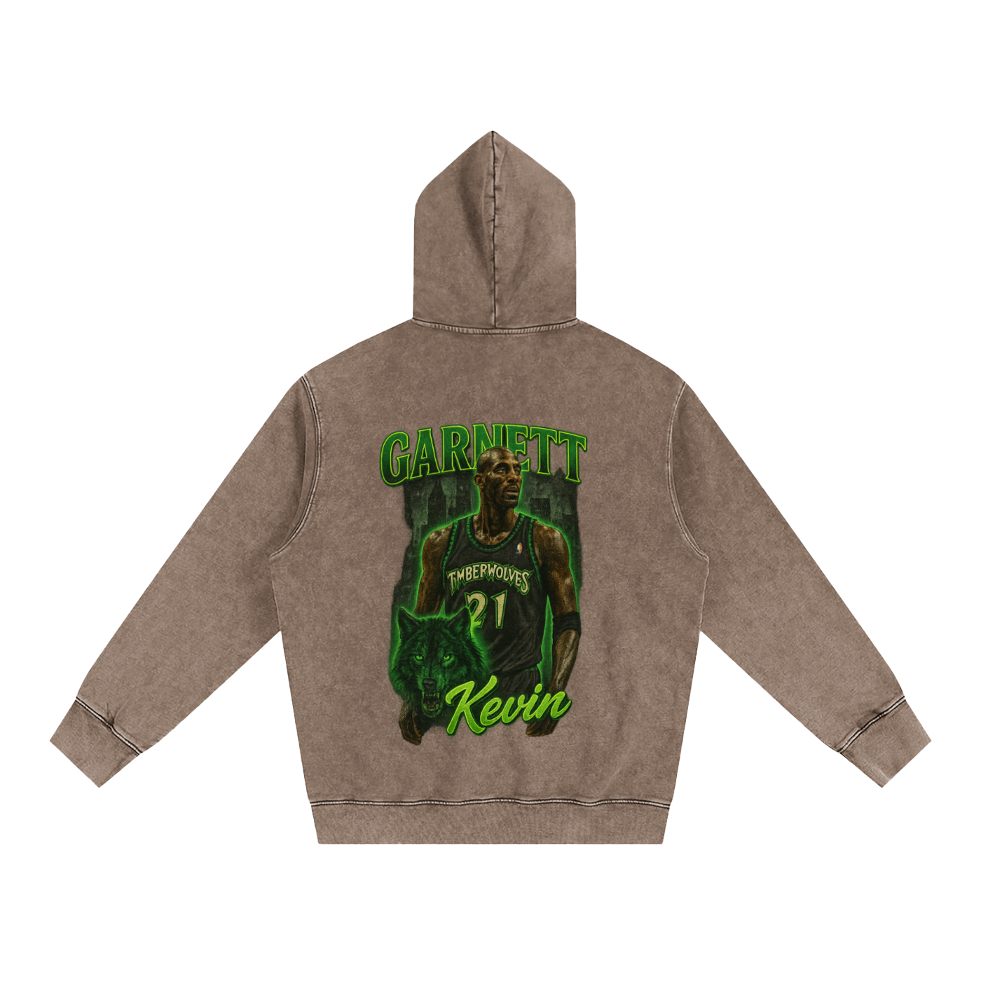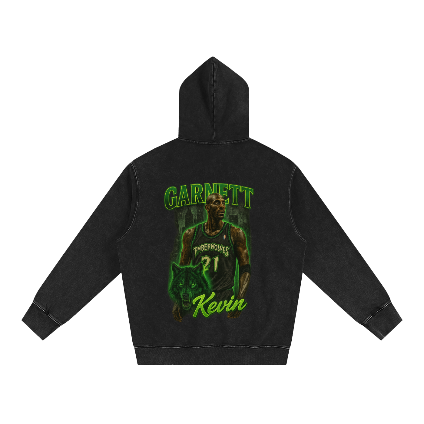 The design’s drenched in radioactive green — gothic “GARNETT” up top, script “Kevin” at the bottom, and that fierce #21 jersey dead center. It's streetwear meets hardwood rage.