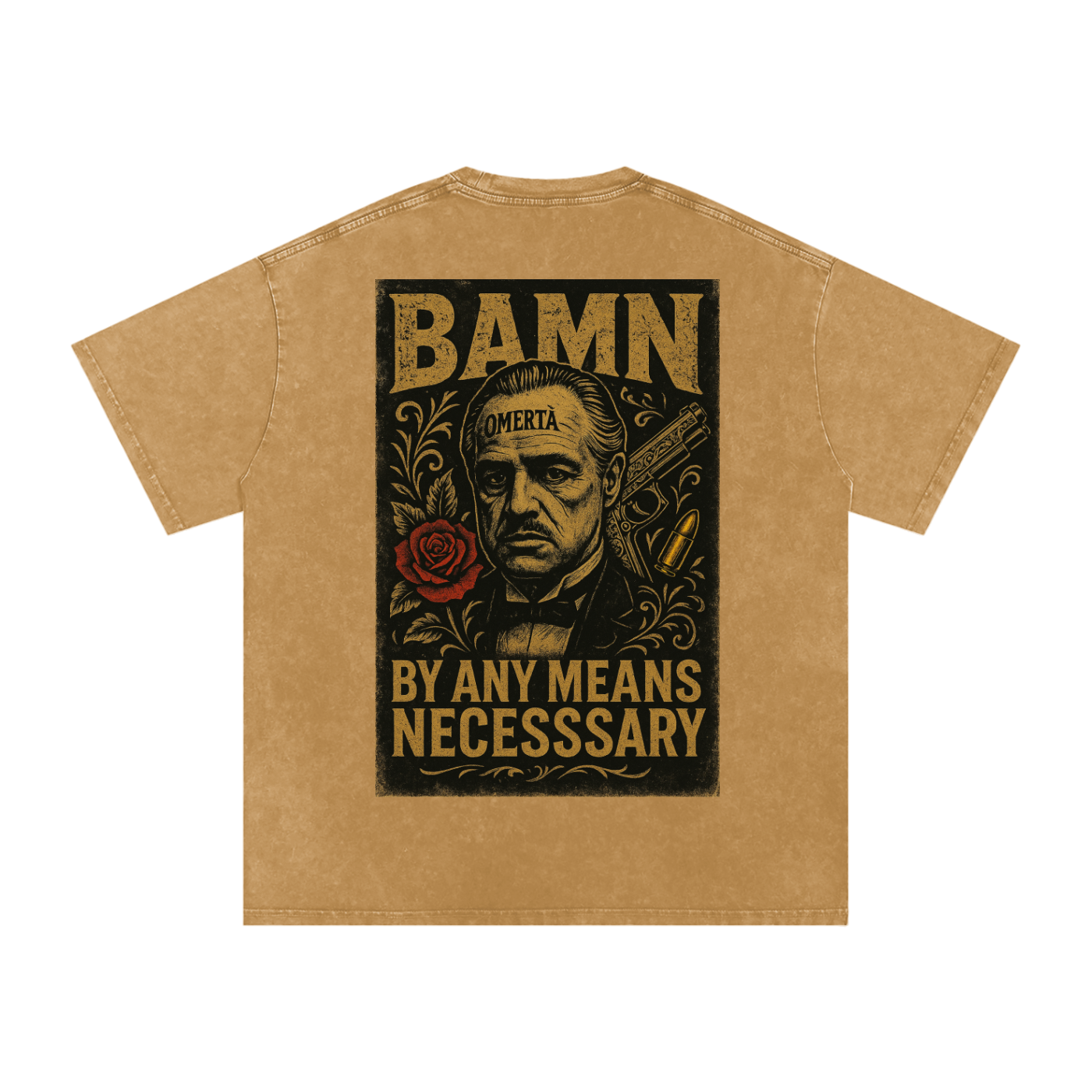 This tee don’t talk — it whispers power. BAMN meets The Godfather in a vintage crime-laced print that’s all about respect, loyalty, and doing whatever it takes to protect the code. Front and center sits Don Corleone, face cold as marble, the word “OMERTÀ” stamped across his forehead like a vow of silence carved in stone.
