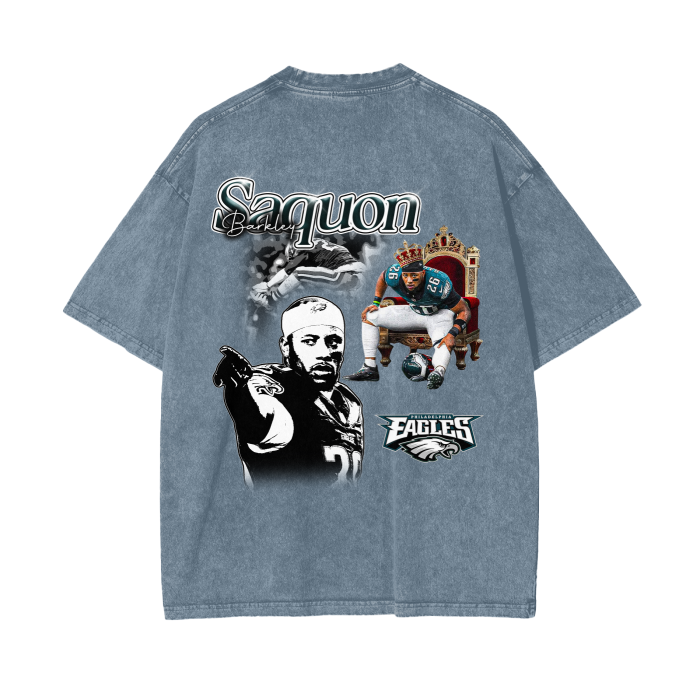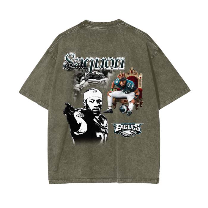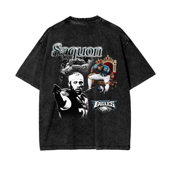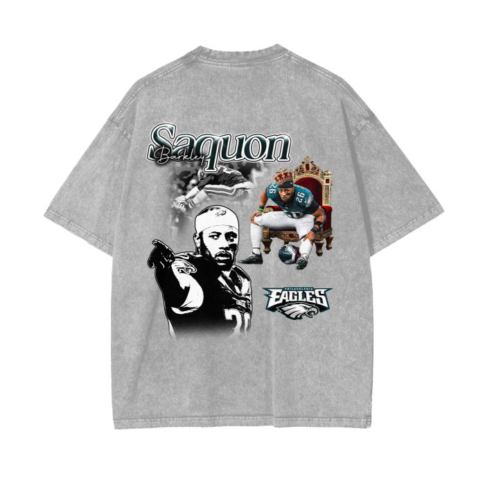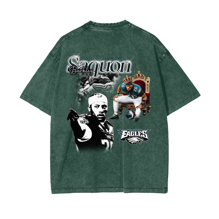 Laid out on a washed black canvas, this design paints Saquon Barkley like the king he is — throned up in Eagles green, crown on, cleats kicked out, and eyes locked on the future. Behind him, a blurred-out stiff arm and a cold, grayscale portrait show both the power and the poise. At the bottom, the Philadelphia Eagles logo ties it all together — loud, proud, and battle-ready.