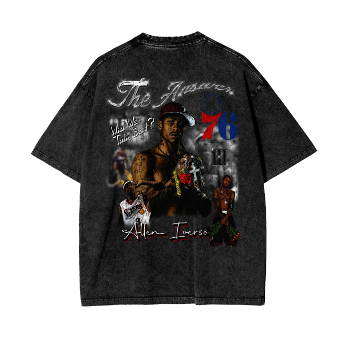 Above, “The Answer” is styled in icy script, stamped with the 76ers logo and his signature across the bottom in blood-red thread. Around him, iconic snapshots flash moments of style, sweat, and soul — from game time to streetwear greatness. Every frame drips culture.