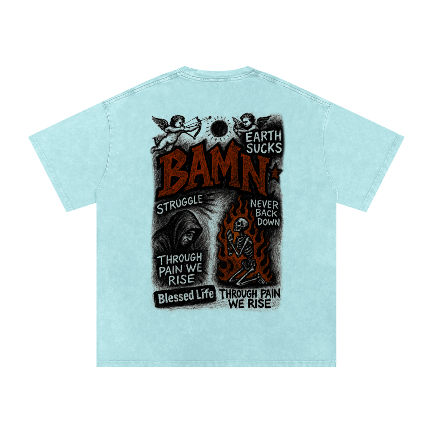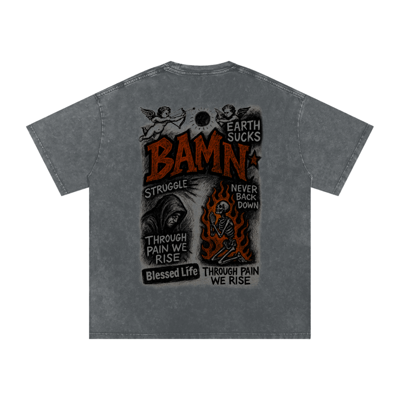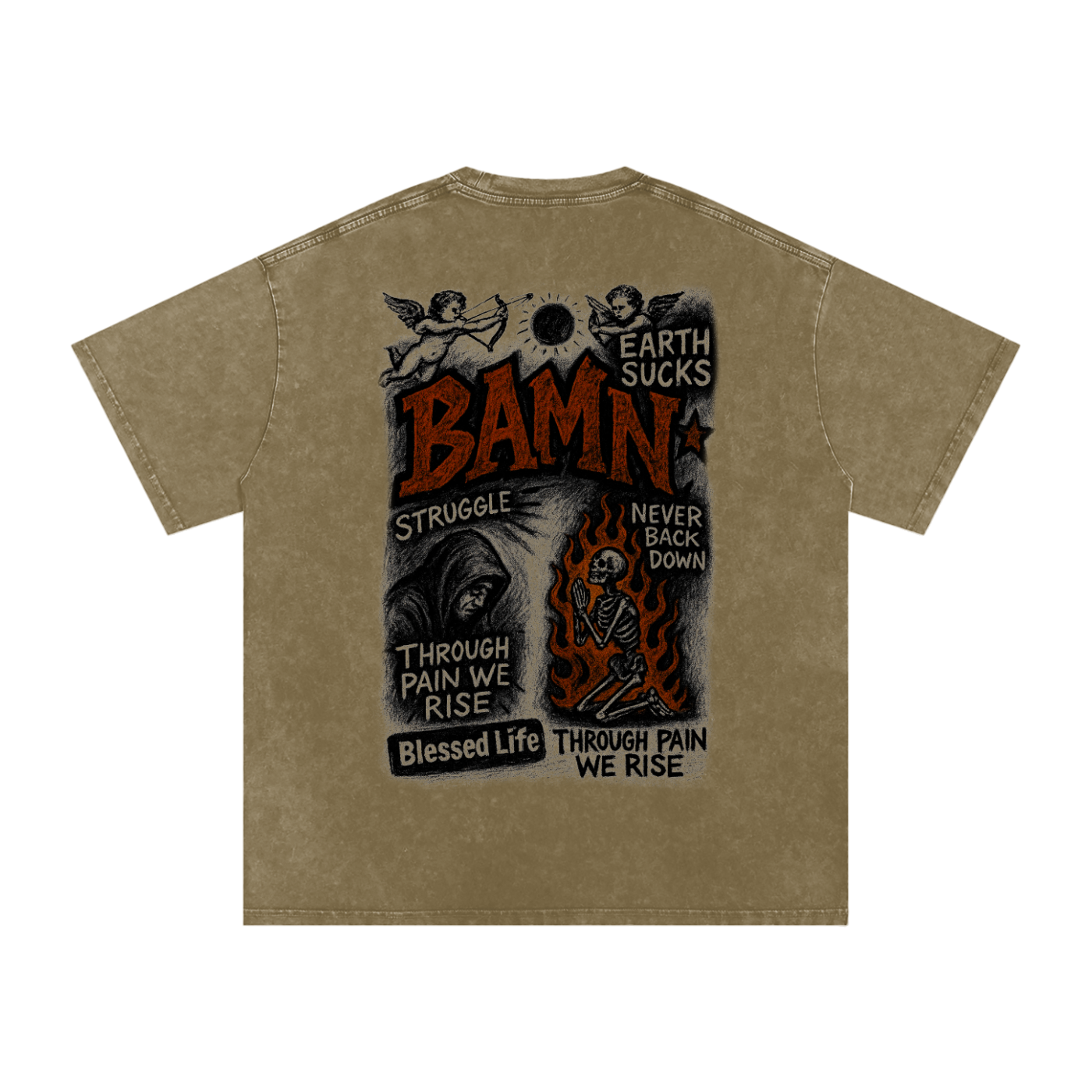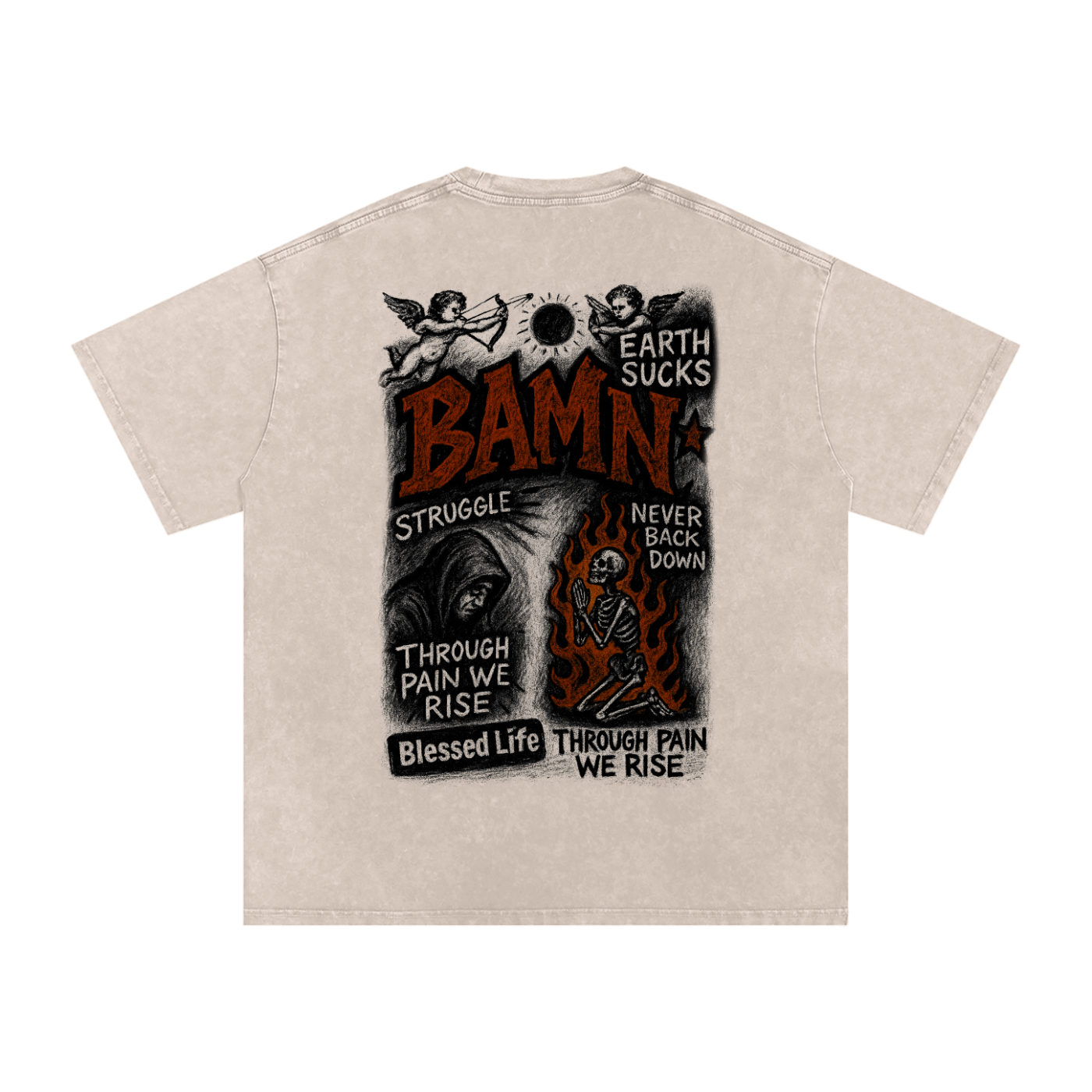 This tee bleeds truth — a gritty, soul-scorched manifesto for anyone who’s ever fought fire with faith. With bold BAMN lettering carved in burnt orange and surrounded by chalky sketch-style visuals, it’s both street gospel and spiritual warfare.